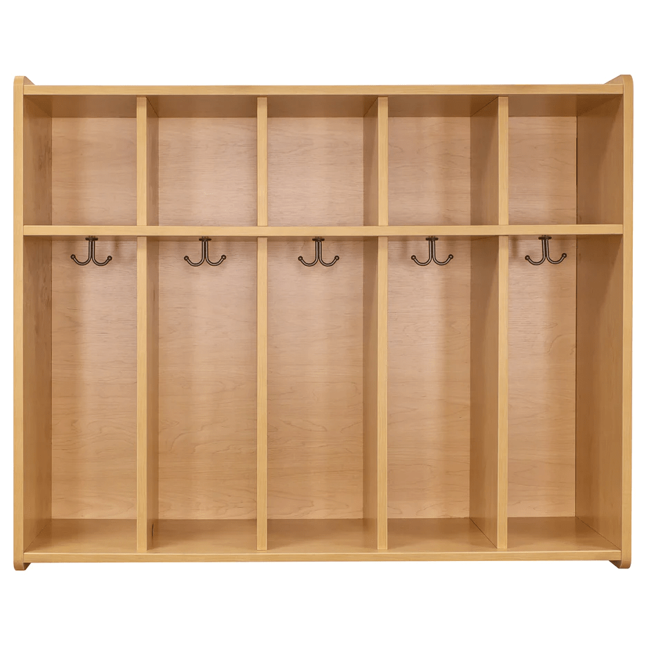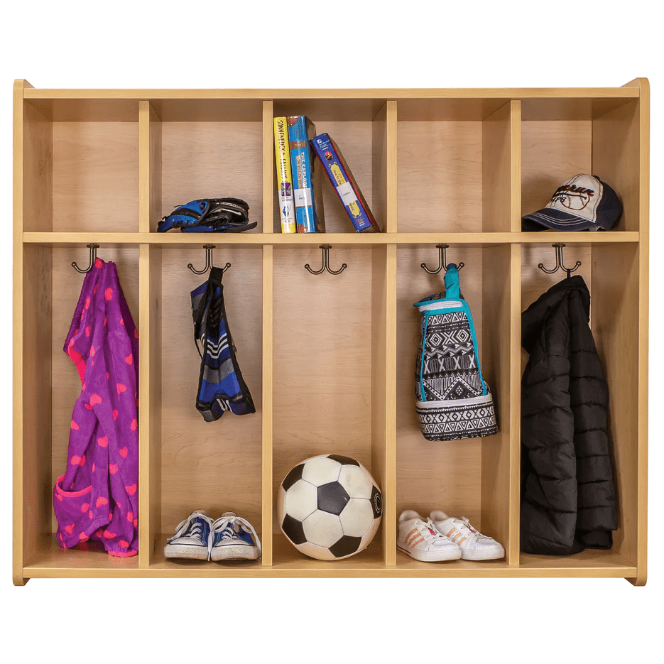 - 5 locker compartments with sturdy double coat hooks, 8-1/4″W x 23-1/2″H x 13-1/2″D